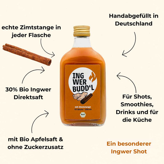 Unserer Meinung nach sind Ingwer Shots die einfachste und zugleich eine der leckersten Möglichkeiten, Ingwer gezielt zu genießen. Mit unseren INGWER BUDD'L Shots bieten wir dir diverse hochwertige Ingwer Shot Sorten, die du ganz bequem in unserem Onlineshop kaufen kannst. So kannst du täglich von den Vorteilen des Ingwers profitieren – ohne Aufwand, ohne Schnippeln, ohne Pressen. Einfach schütteln, trinken und genießen!Unsere INGWER BUDD'L Ingwer Shot Sorten